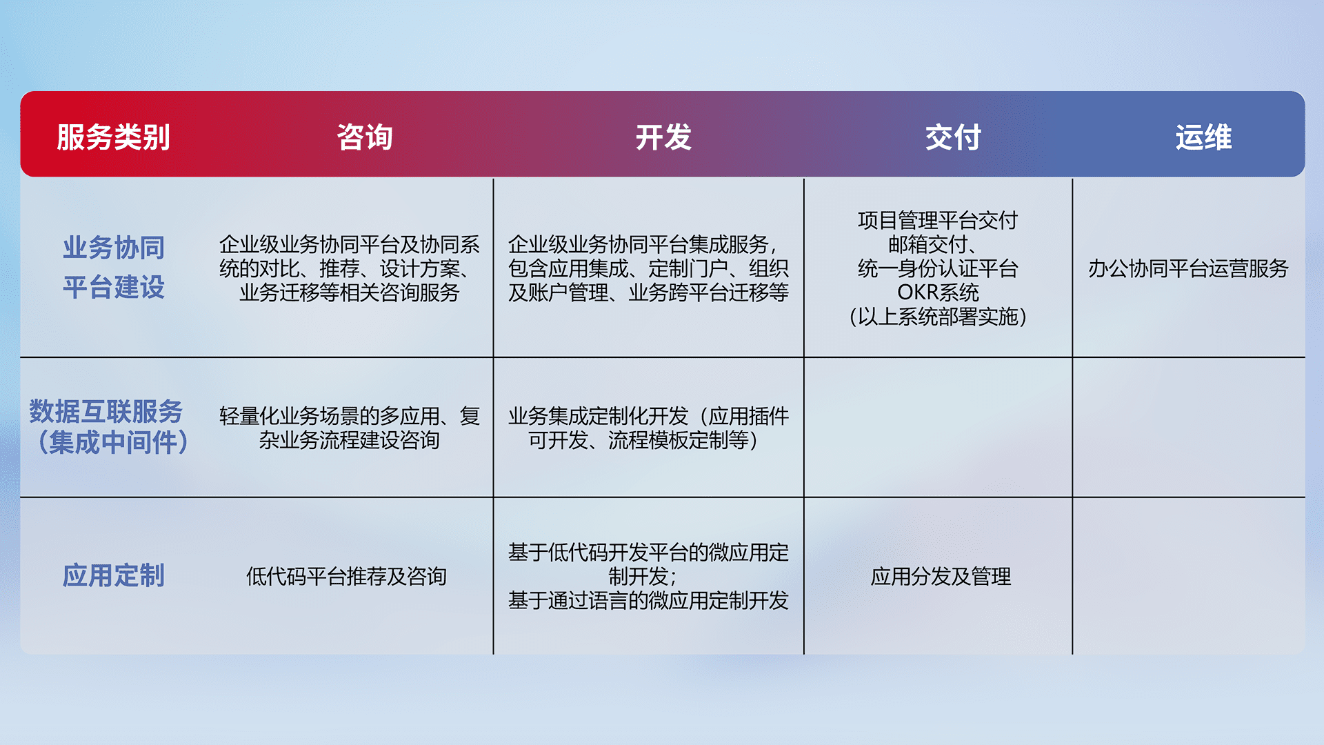 针对钉钉、、、、企微、、、、IDaas等平台级产品提供产品的规划、、方案、、、、交付、、、定制化开发等服务,,实现如统一协同办公、、、智能客户服务、、混合会议管理、、、、智能数据查询、、等业务场景,,实现数字化转型。。。